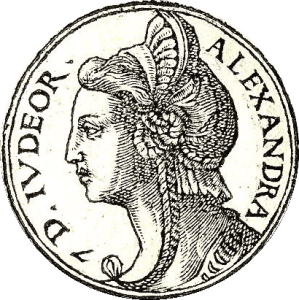 According to Antiquities, it seems Alexandra was married to Aristobulus I of the Hasmonean dynasty. There is some debate on this point, for in Wars the name of his queen is Salina Alexandra. It is possible these are attempts to render the queen’s Hebrew name into Greek [2] or that Josephus is unifying the accounts of two different women. [3] Assuming that it is the same woman, Alexandra became a widow and upon Aristobulus I’s death she released his brother Alexander Jannus from prison and made him king. Though it is not explicitly stated, it seems that Alexandra married Alexander Jannus, possibly as a levirate marriage as she had no children with Aristobulus I. Alternatively, it is conceivable that a marriage to the queen may have been expedient for political reasons to ensure Alexander’s right to the throne. Despite these questions the couple had two children during his 27-year reign. The king and youngest son were seemingly allied to the Sadducees while the queen and eldest son favored the Pharisees. After her husband’s death she imparted power to the Pharisees and gained their support, thus sealing her authority as regnant queen. She appointed her oldest son Hyrcanus II as high priest because he was uninterested in politics, and she restored the traditions and practices of the Pharisees that had been abolished. Toward the end of her 9-year rule she became ill and her youngest son, Aristobulus II, attempted to seize control of the government. He aligned himself with his father’s former friends and took control of several of the fortresses. When Alexandra realized she was in danger of a coup, she and the elders of the Jews feared his retribution and they put Aristobulus II’s wife and children in prison. Alexandra died without resolution to her children’s battle for control. She did not give any last orders to be administered upon her death but remarked that she was leaving them a happy, prosperous nation with a good army. After her death, her sons engaged in a civil war for power and invited Roman intervention. Ultimately this move brought about the invasion and control of the kingdom by the Roman republic.