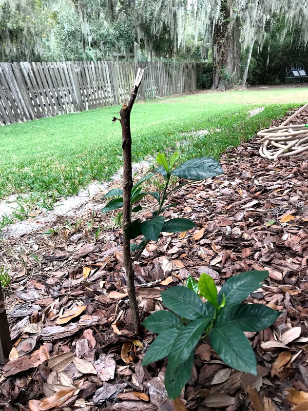 When we moved to our new home, we were sad to leave our gardenias behind and kept saying over and over we needed to plant a new bush here. For one reason or another we never did until I planted a dead looking stick, and it came back to life.
