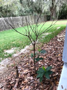 At last, all the leaves fell off and it was totally bare. I had a stick in a pot on my back porch and wondered why I hadn’t just planted it in the yard sooner. I couldn’t decide where it should go but now it seemed too late. Ever the optimist I figured I’d give it a shot and I planted my stick on the other side of the screen with a laugh and gave it my best wishes.